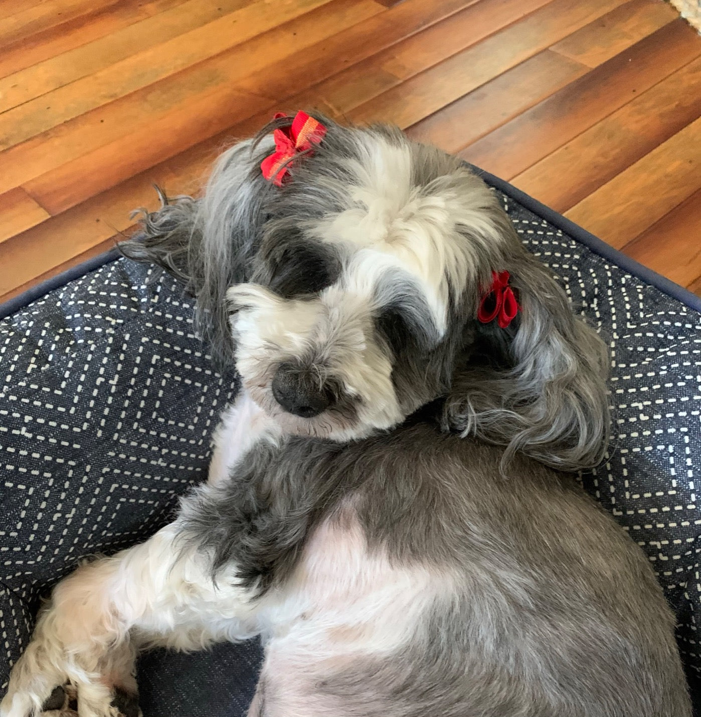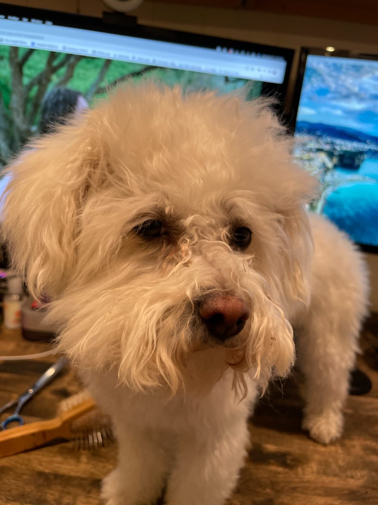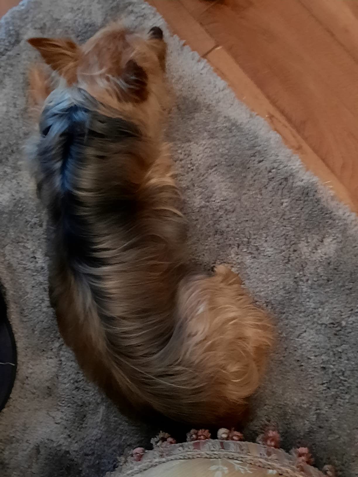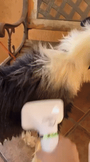 esta un poco ansiosa, pero como el secador de pelo no hace tanto ruido, se relajo y obviamente lo disfruto. El pelo es fácil de quitar del cepillo. Estoy encantada -